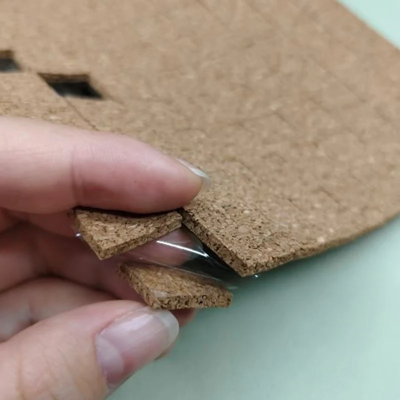 Пробковые транспортировочные прокладки размером 1/8 x 3/4 x 3/4 дюйма с липкой подложкой, состоящие в основном из пробки и съемного клея, а также бумаги или прозрачного ПЭТ в качестве вкладыша на обратной стороне, упакованные в коробку в виде листов или рулонов, как показано ниже: